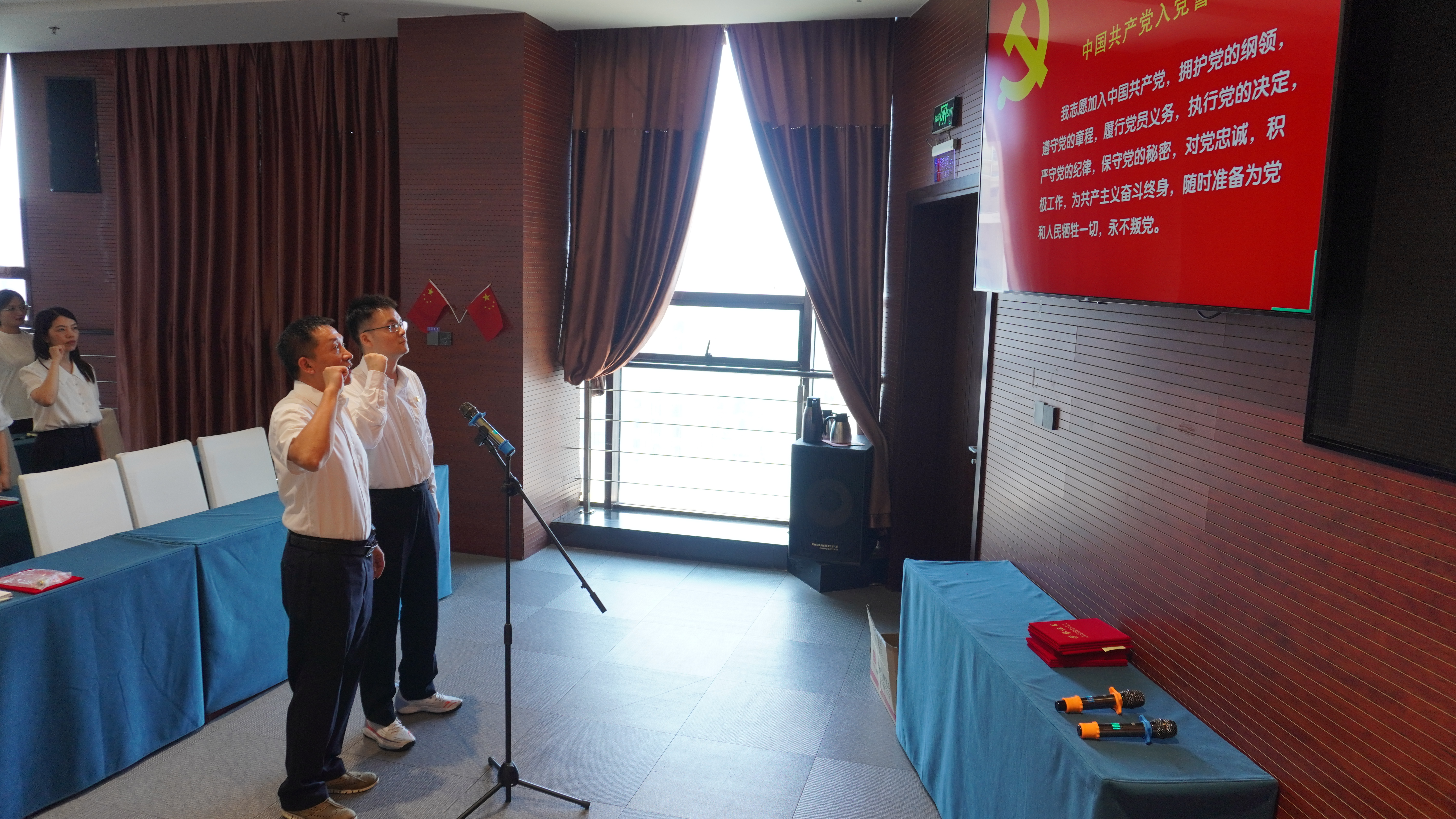公司黨委委員、紀(jì)委書記、工會(huì)主席董峰帶領(lǐng)新黨員宣誓、老黨員重溫入黨誓詞。