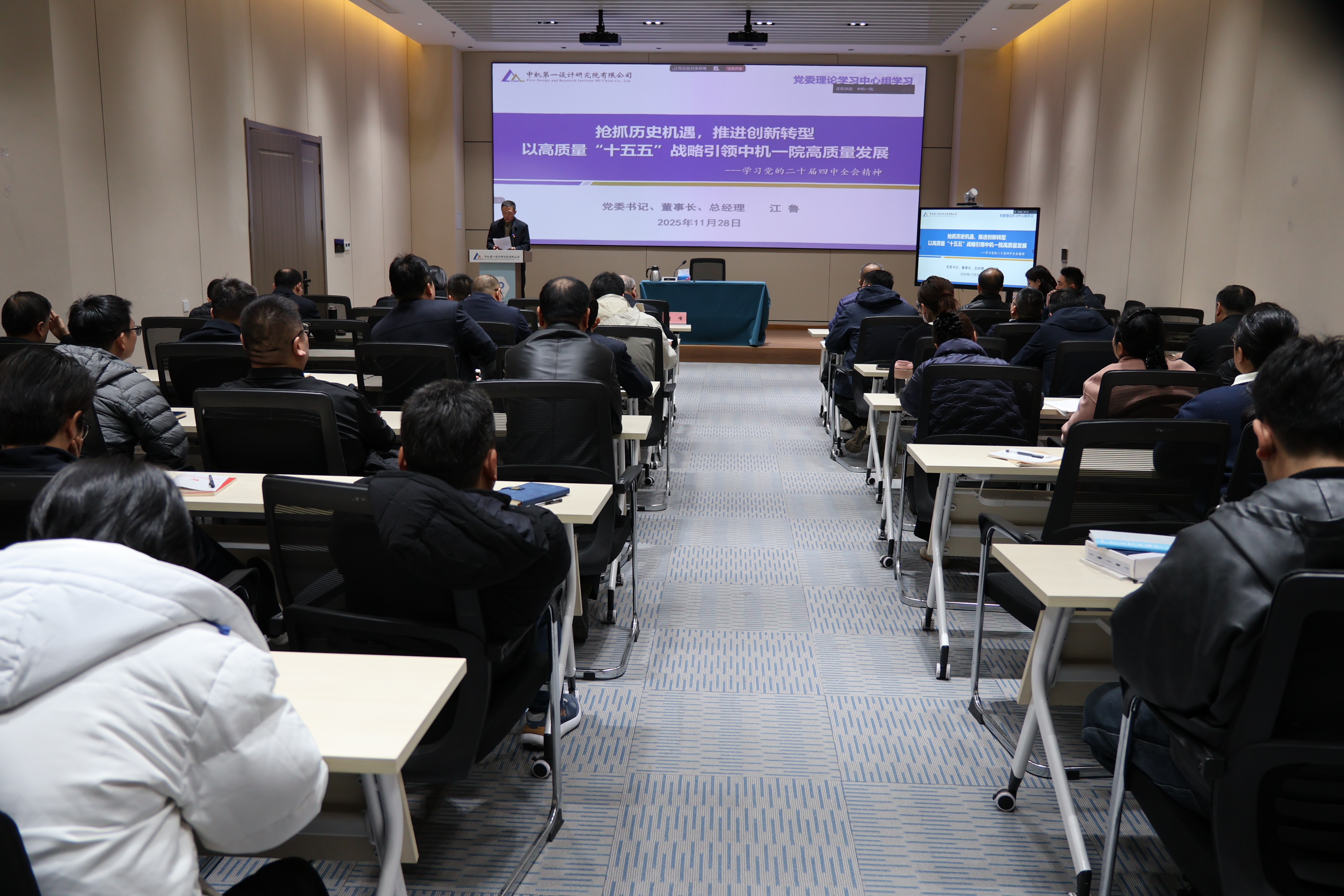 11月28日,中機(jī)一院黨委書記、董事長(zhǎng)、總經(jīng)理江魯以《搶抓歷史機(jī)遇,推進(jìn)創(chuàng)新轉(zhuǎn)型,以高質(zhì)量“十五五”戰(zhàn)略引領(lǐng)中機(jī)一院高質(zhì)量發(fā)展—學(xué)習(xí)貫徹黨的二十屆四中全會(huì)精神》為題講授專題黨課,公司黨委委員、紀(jì)委書記董峰主持會(huì)議,公司領(lǐng)導(dǎo)班子成員參加。